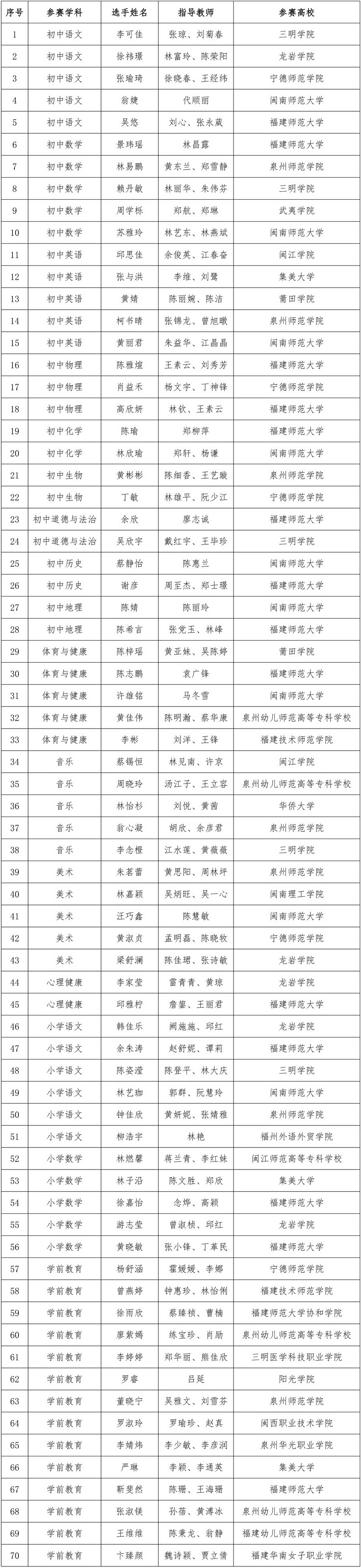 12月5-6日,全省39所高校226位选手参加在在宁德师范学院举办的第十二届福建省高校师范生教学技能大赛,最终评选出一等奖51名、二等奖70名、三等奖68名、优秀奖37名,优秀指导教师36名、优秀组织奖10个,现将获奖名单予以公布。
