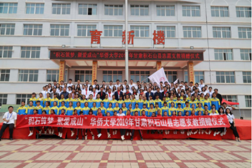 7月24日上午,华侨大学2019年甘肃积石山县志愿支教捐赠仪式在积石山县移民中学举行。华侨大学党委副书记刘斌,甘肃省委统战部九处副调研员刘小平,华侨大学校长办公室、团委相关负责人,以及临夏州和积石山县党政领导、受赠学校校长、学生代表和支教团全体志愿者等500余人参加活动。