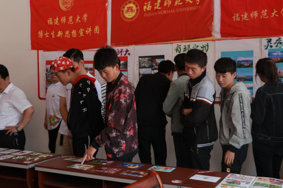 推荐会分“清新福建”“灵秀福州”“百年福师”三个板块,展示近百件视频、图像、文化创意产品,实践团成员向参观的村民、学生进行现场讲解,介绍福建的美景风情和历史底蕴,讲述福建的红色经典故事,展示福建特色的茶文化等,增进宁夏群众对福建的了解,进一步宣传了“闽宁协作”的做法与成果。同时,实践团还将福建师范大学学生创作的“福师大小葵”系列新思想网络文创产品带到现场,用水彩画、沙画讲解社会主义核心价值观,用漫画教会孩子们熟记“我们的传统节日”,用福建传统剪纸向孩子们宣传“中华传统孝道文化”。整个推荐会现场人头攒动,特别是“党的十九大精神进农村”“小葵说支部条例一起学”等系列新思想文创产品形式新颖,村民和孩子们流连忘返,纷纷在留言区写下对祖国70周年华诞的祝福。