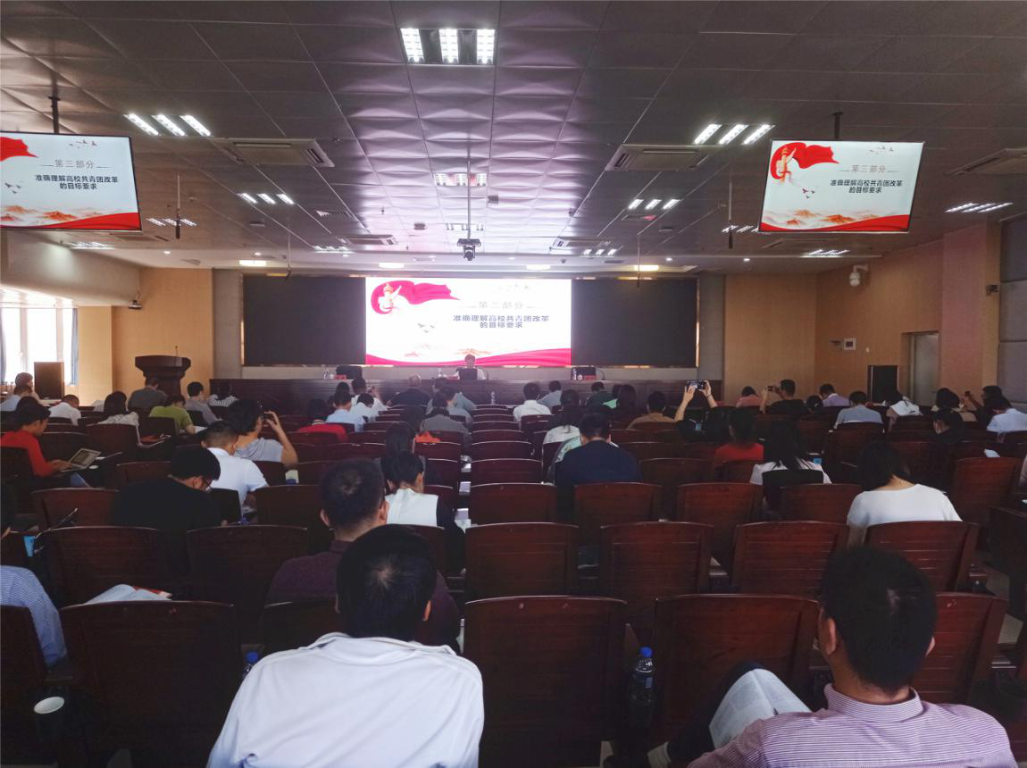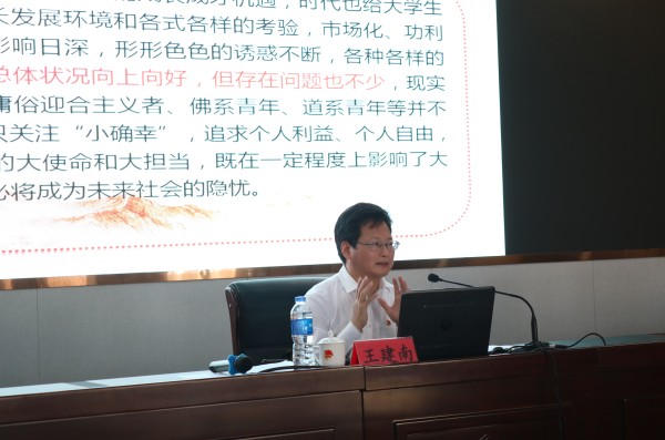 王建南围绕学习宣传贯彻党的十九届五中全会精神、学习贯彻习近平总书记在中央党的群团工作会议、全国教育大会、高校思想政治工作会议和学校思想政治理论课教师座谈会上的重要讲话精神,推动高校共青团工作创新发展,发挥高校共青团在立德树人中的生力军作用,作了一场主题鲜明、内容丰富的专题报告。他运用大量鲜活的事例、详实的数据,深刻阐释高校立德树人工作的重要意义,梳理归纳高校立德树人工作的根本遵循,深入分析高校共青团改革的目标任务,明确提出深化新时代高校共青团、学生会、学生社团改革创新和围绕立德树人根本任务充分发挥共青团生力军作用的具体要求。