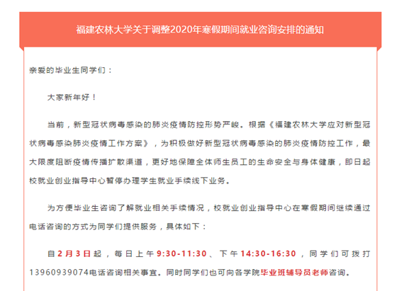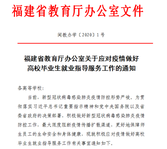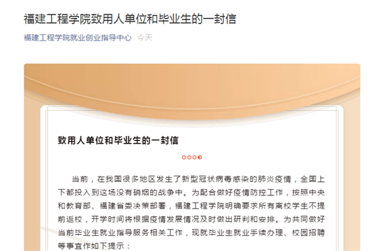 福建工程学院等高校就业指导部门发布公告,致信用人单位和毕业生,将原计划的春季线下双选会挪到线上,鼓励企业通过学校QQ群电话、视频面试,利用快递等方式办理就业签约等,尽最大可能满足毕业生求职需求。