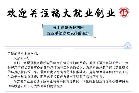 对于正在或是准备办理毕业手续的同学,福州大学、福建农林大学等高校就业指导部门发布了详细的就业手续办理内容指导,指导同学们通过邮寄、请专职辅导员代办、线上提交电子材料等方式,完成就业手续相关事宜。