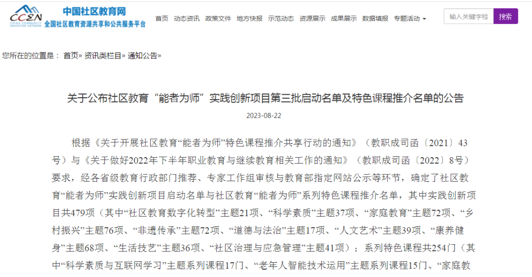 据悉,自教育部2021年11月开展社区教育“能者为师”特色课程推介共享行动以来,我省申报的三批实践创新项目共54项入选,63门课程和25个典型案例获推介,数量居全国前列。入选的项目和被推介的课程、案例将在中国社区教育网、日新学习网、“网上社区教育大讲堂”微信公众号进行展示。同时,我省将在终身教育活动周期间积极宣传实践创新项目和特色课程的典型经验,充分发挥示范引领作用。