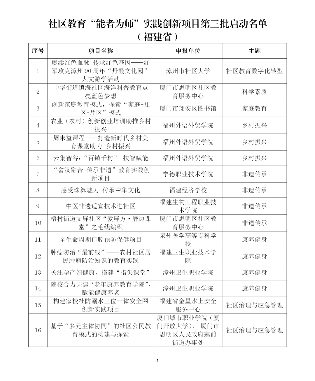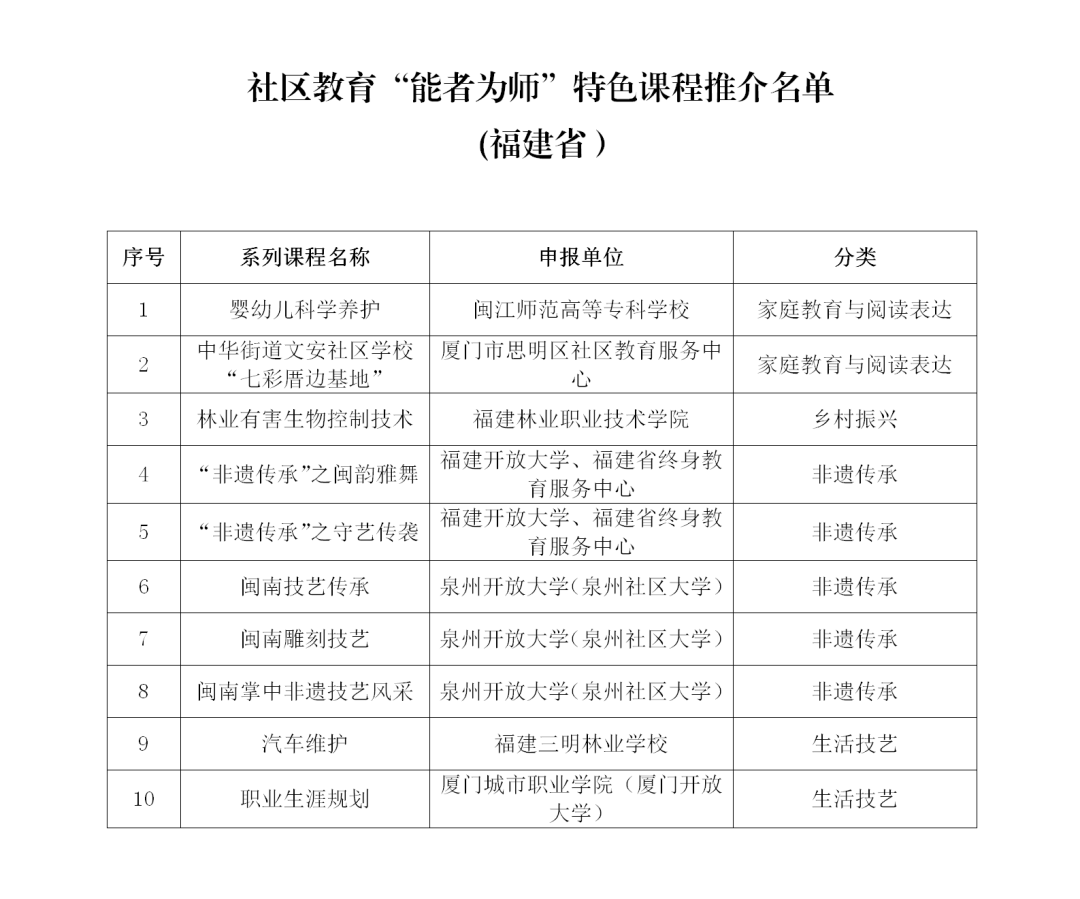 近日,教育部职业教育与成人教育司发布《关于公布社区教育“能者为师”实践创新项目第三批启动名单及特色课程推介名单的公告》,经各省级教育行政部门推荐、专家工作组审核与教育部指定网站公示等环节,全国共启动第三批实践创新项目479项,共254门系列特色课程被推介。我省漳州市社区大学申报的“赓续红色血脉传承红色基因——红军攻克漳州90周年‘丹霞文化园’人文游学活动”等16个项目入选,福建开放大学、福建省终身教育服务中心推荐的“‘非遗传承’之闽韵雅舞”等10门课程获推介。