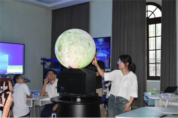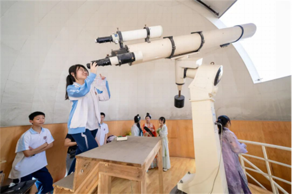 地理教室内,指导老师用穹顶天幕和全息投影进行有关月相的讲解,引导学生深入了解月相随日期变化以及成因。并与师生们交流了传统文化中的七曜与天文、三元二十八星宿——中国古代的星官体系、古诗词中的天文、中西古代天文的交集等内容。天文、摄影小课堂过后,激动人心的观测月相活动在学校天文台开展,学生们争相使用天文望远镜一睹月亮真容。