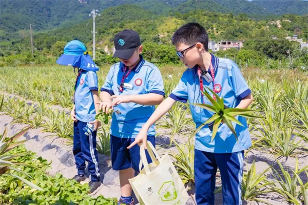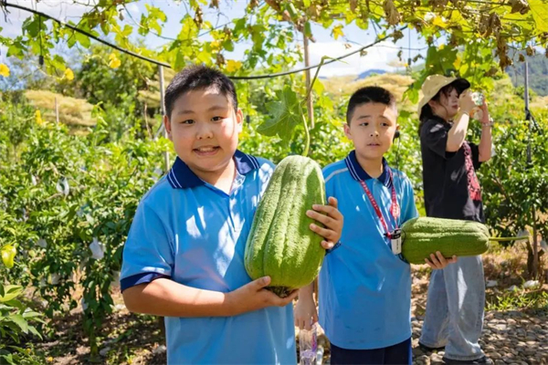厦门市滨东小学组织五年级学生前往同安同享莲花,进行“劳动养成,耕读传家”劳动研学课程。同学们走进田间地头,探访瓜果园的秋日物语,了解菠萝与凤梨的差别,丝瓜的成长历程,还自己动手采摘蔬菜。