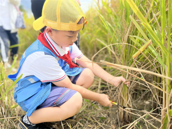 永春的田间地头,大片大片金灿灿的稻谷映入眼帘。石狮市第三实验小学三年二班的学生们手持镰刀,蹲下小小的身子,抓起一把金黄的稻穗,小心翼翼地收割。