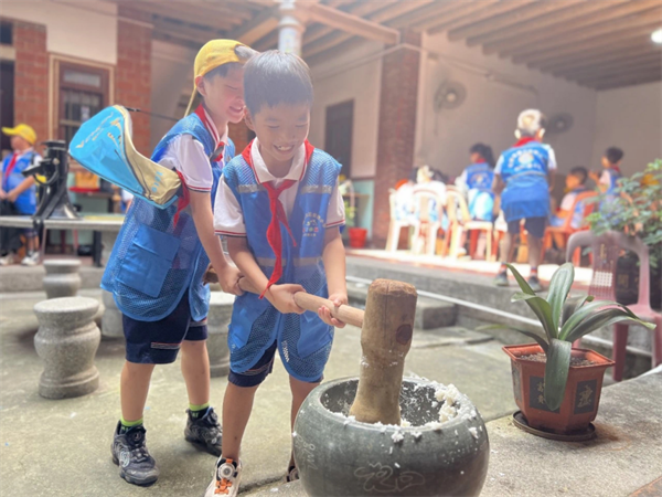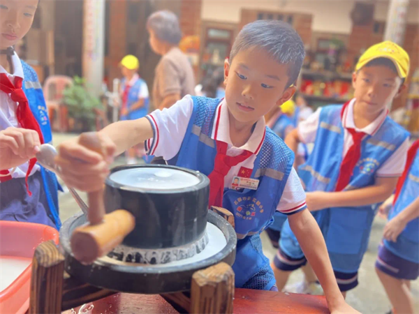 “劳动砺心智,实践促成长”。割完稻谷,学生们在老师的指导下磨起了米浆、打起了糍粑,在劳动过程中体会“自己动手,丰衣足食”的快乐。