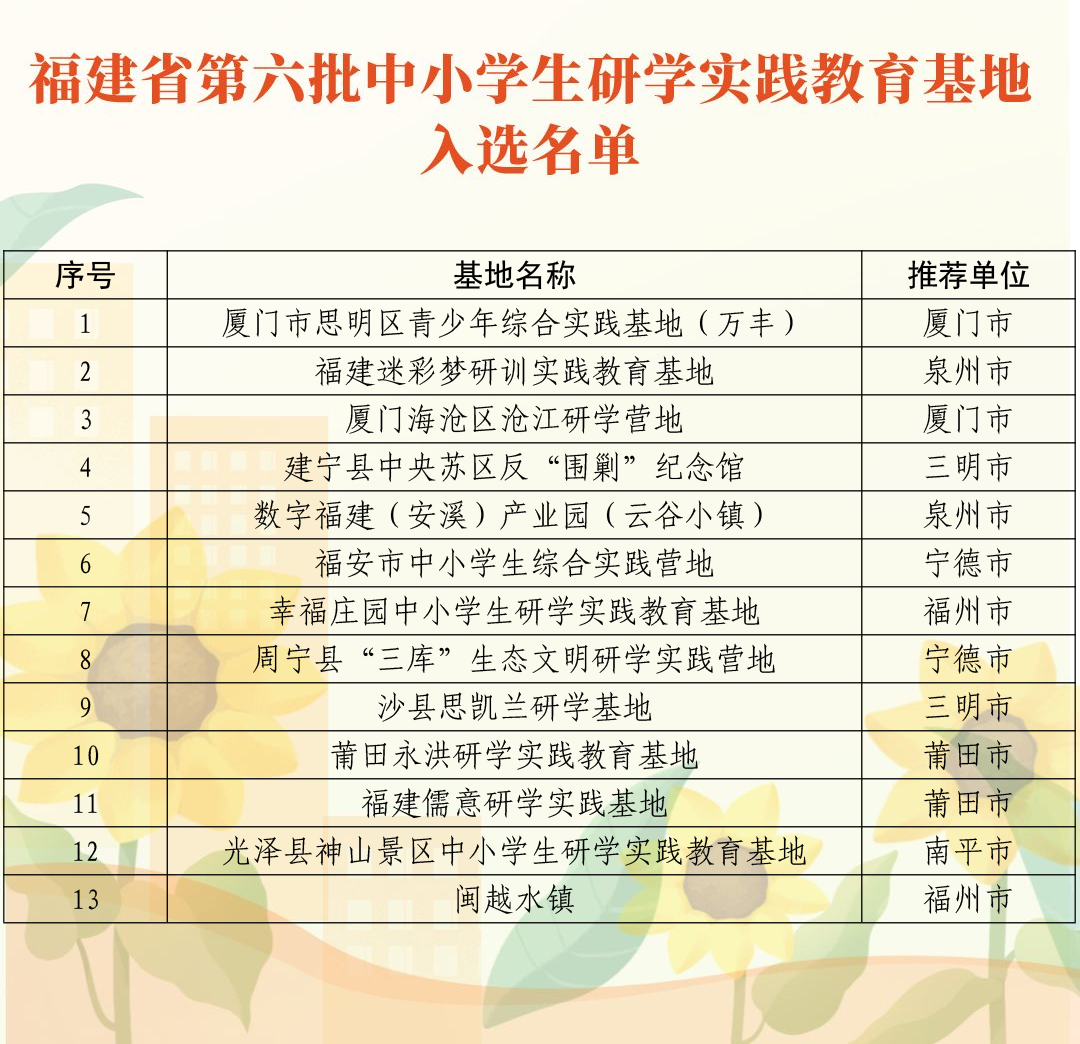 近日,省教育厅印发《关于公布第六批中小学生研学实践教育基地和第四批中小学生劳动教育实践基地名单的通知》,确定13个申报单位入选我省第六批中小学生研学实践教育基地;8个申报单位入选我省第四批中小学生劳动教育实践基地。具体名单如下: