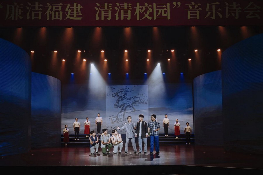 整场音乐诗会紧扣“廉洁福建•清清校园”的主题,集价值引领、文学感染、音乐表现与视觉冲击于一体,通过时空对话、沉浸式音诗画、器乐演奏、歌舞等艺术形式,将廉洁元素转化为具象的舞台呈现,生动演绎了林则徐、林觉民、王荷波、谷文昌、吴孟超、陈祥榕等八闽清廉代表人物的动人故事,有力表达了八闽学子传承清廉基因、扣好人生“第一粒扣子”的坚定信念,营造了八闽校园自觉学廉思廉传廉践廉的浓厚氛围。