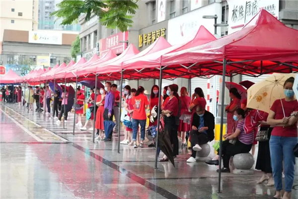 在考点周边还有这样一群人,他们身着红装,默默为考生和家长提供各类服务,成为考场外独特的风景。