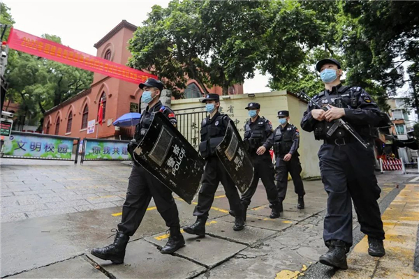 特警在考点移动巡逻