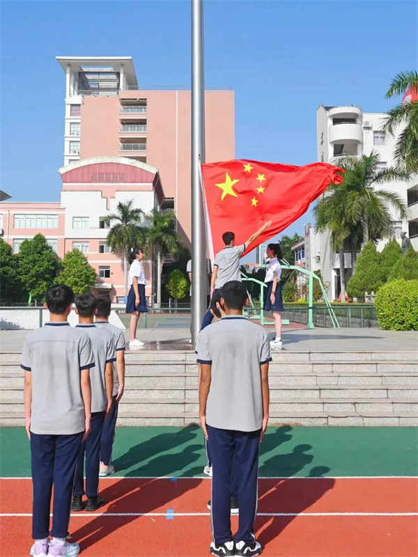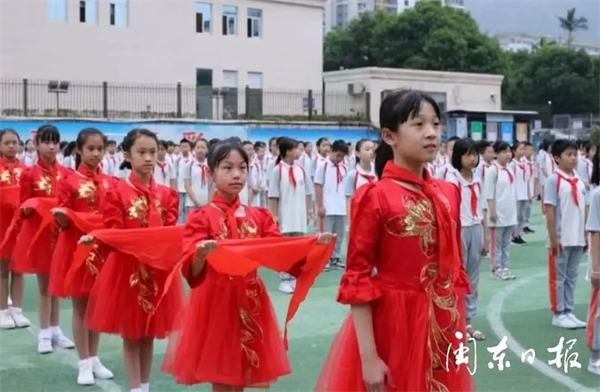 在庄严的国歌声中,五星红旗冉冉升起,迎风飘扬。全体师生列队肃立,向着国旗庄严敬礼。蕉城区实小学生带来口琴表演《雏鹰之梦》和诗朗诵,展示了新时代青少年爱党爱国、向上向善、奋发有为的精神风貌。