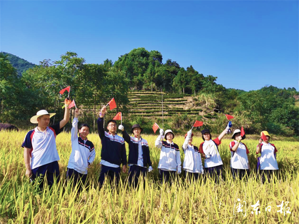 在福安康厝畲族乡半山村,宁德市民族中学学生体验了割稻、打稻、晒稻、挑稻等劳动工序,并用稻谷在晒垫上摆出“祖国万岁”字样,为祖国母亲送上生日的祝福。劳动结束后,一曲高亢的《我和我的祖国》、一面面挥舞的五星红旗,展现了师生们对伟大祖国的感激和对丰收的喜悦。