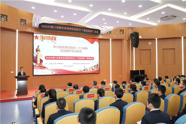 12月2日,厦门市教育局在厦门大学附属科技中学思明校区举行教育系统国家宪法日“宪法晨读”活动。学校朗诵艺术团的同学们带来的诗朗诵《宪法伴我成长》,表达了他们弘扬宪法精神、维护宪法尊严的决心。