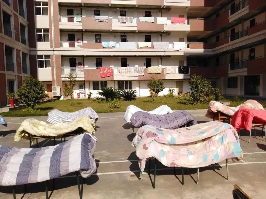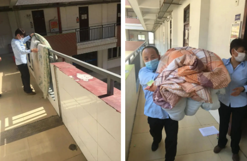 为了迎接学生返校,近日,福建水利电力职业技术学院启动了“晒被子工程”。这几日,只要是阳光明媚的日子,学生宿舍区就会出现宿管人员忙碌的身影。他们制作标签、擦栏杆、确认每件物品的位置,每一床被子都被“温暖”以待。