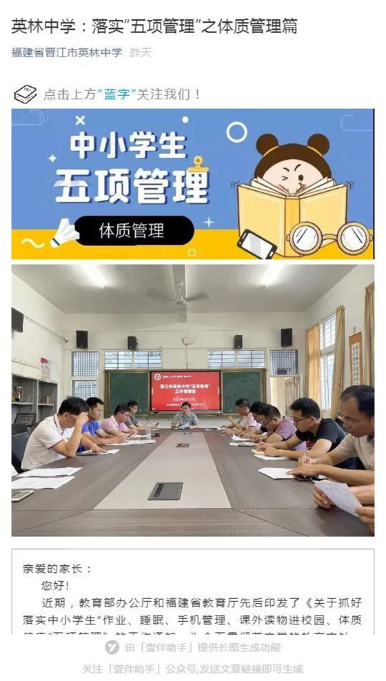 6月13日至16日,晋江英林中学利用学校微信公众号以每天一篇推文的形式,结合学校教学工作向家长逐项解读“五项管理”的内容。让家长清楚“五项管理”为什么做?做什么?怎么做?引导家长履行相应责任,配合学校共同做好工作。