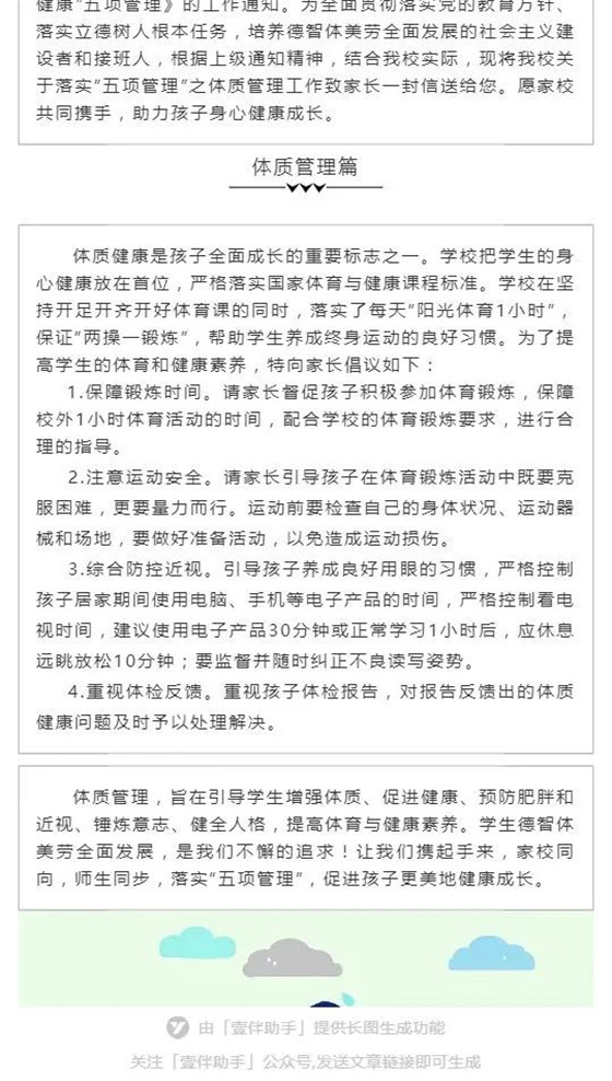 “五项管理”工作需要学校承担主体责任,但许多工作的落细落实,离不开家长的理解和支持。各校纷纷召开贯彻落实工作推进会,发出《致家长的一封信》,形成了一些行之有效的工作方法,涌现出了一些具有特色的典型做法。