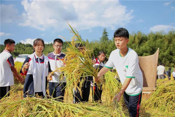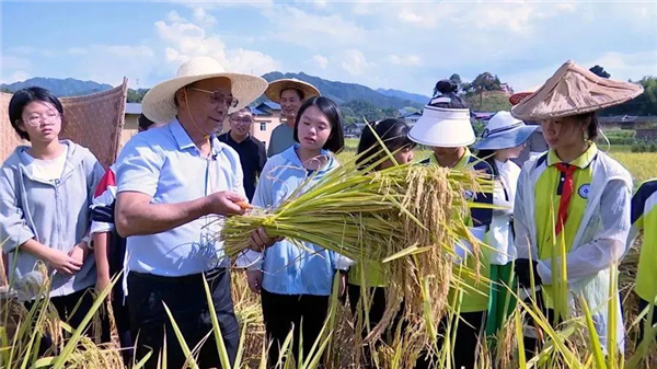 “谢爷爷,您看,您看,我又割了一把!”近日,在龙岩市新罗区适中镇蓝田村的稻田里,一群中小学生在谢华安院士的带领下,一手紧抓稻秆,一手轻挥镰刀,有模有样地收割稻子。