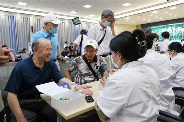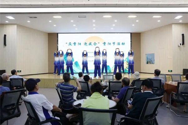 在学校的多功能厅,离退休老同志欢聚一堂,饮茶叙旧,品尝学生制作的养生糕点,聆听秋季养生保健知识讲座,体验康复理疗保健,观摩八段锦、武术表演以及参与手工纺织、叶脉书签、中药香囊制作等,共迎重阳佳节。此外,现场还为两位八十岁的寿星送上充满喜庆与祝福的生日蛋糕。