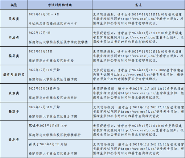 省级统考的音乐类、舞蹈类、播音与主持类、编导类、表演类、书法类等6个类别考点设在福建师范大学旗山校区;美术类的考试地点设在福州城区标准化考点。