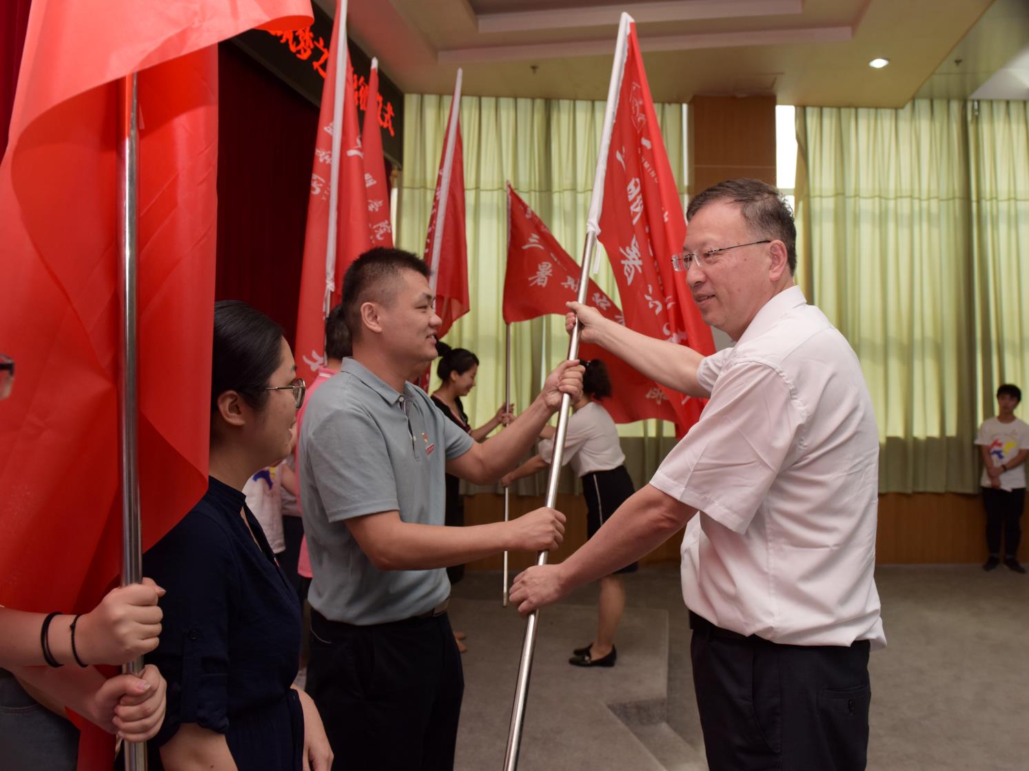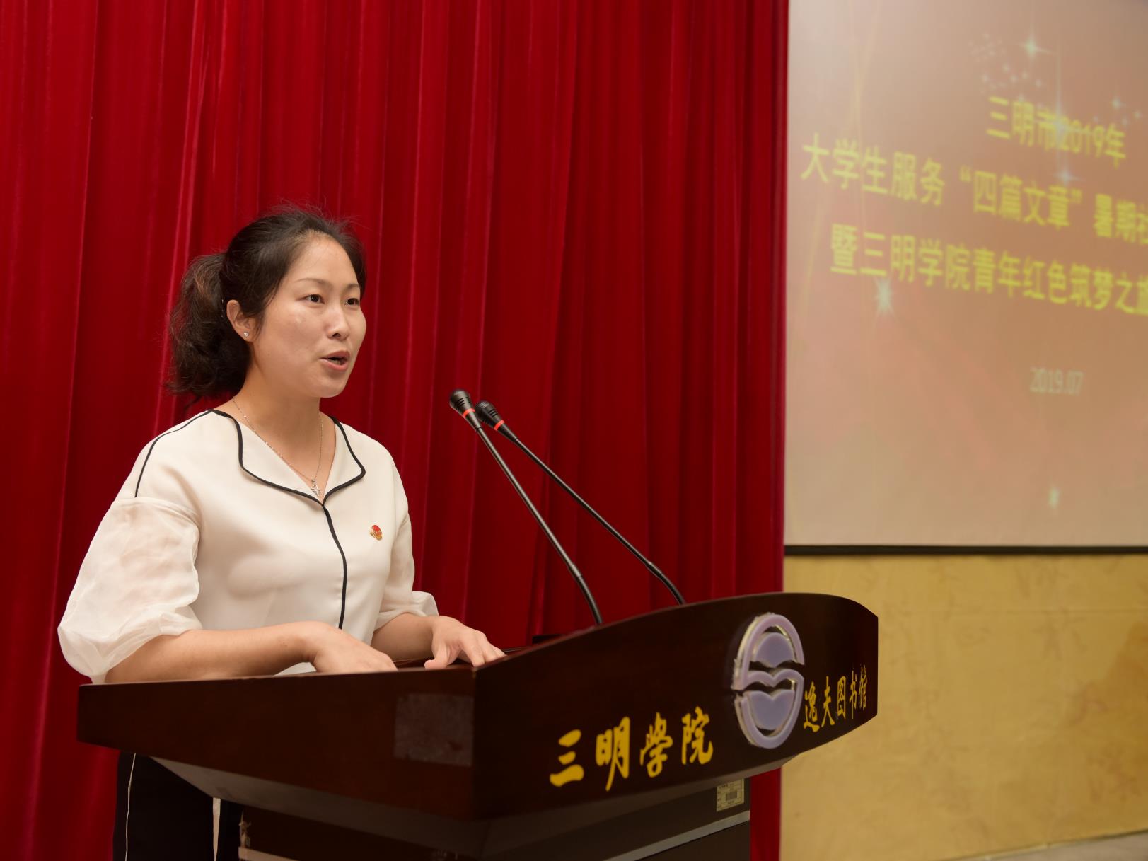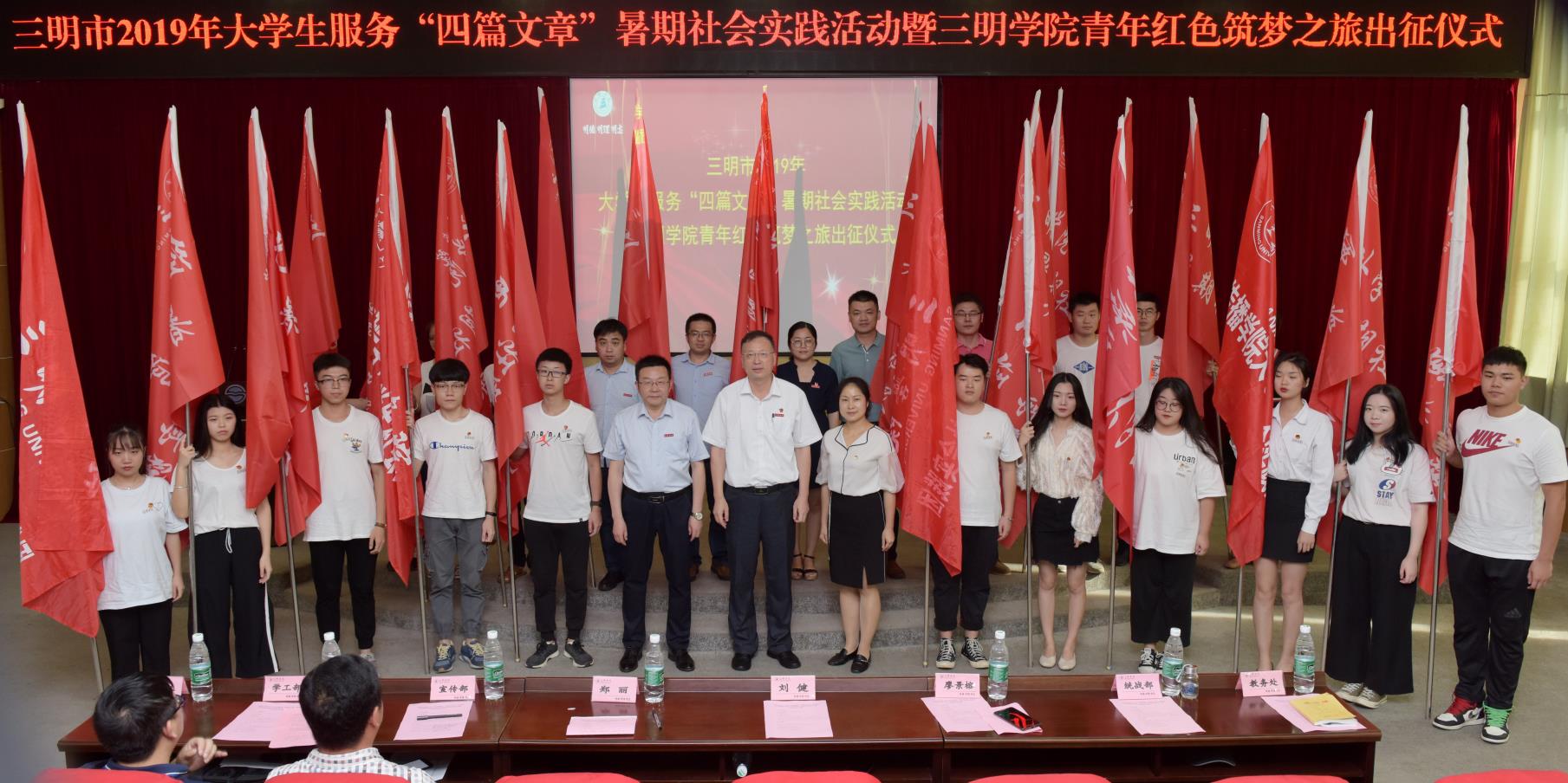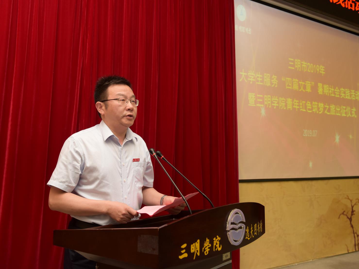 7月3日下午,三明市2019年大学生服务“四篇文章”暑期社会实践活动暨三明学院青年红色筑梦之旅出征仪式在三明学院图书馆学术报告厅举行。三明学院领导刘健、廖景榕,三明团市委副书记郑丽,校内各职能部门、二级学院负责人,暑期社会实践团队师生代表参加活动。