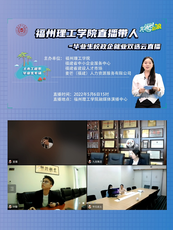 5月6日,福州理工学院副校长谷振宇带领首批毕业生亮相直播间,通过抖音、视频号向中国水利水电第十六工程局有限公司等5家单位和社会公众进行2022届毕业生校政企就业双选“云直播”。