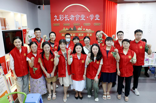 在九彩长者食堂·学堂,省教育厅机关青年干部与社区干部、居民一起包粽子。