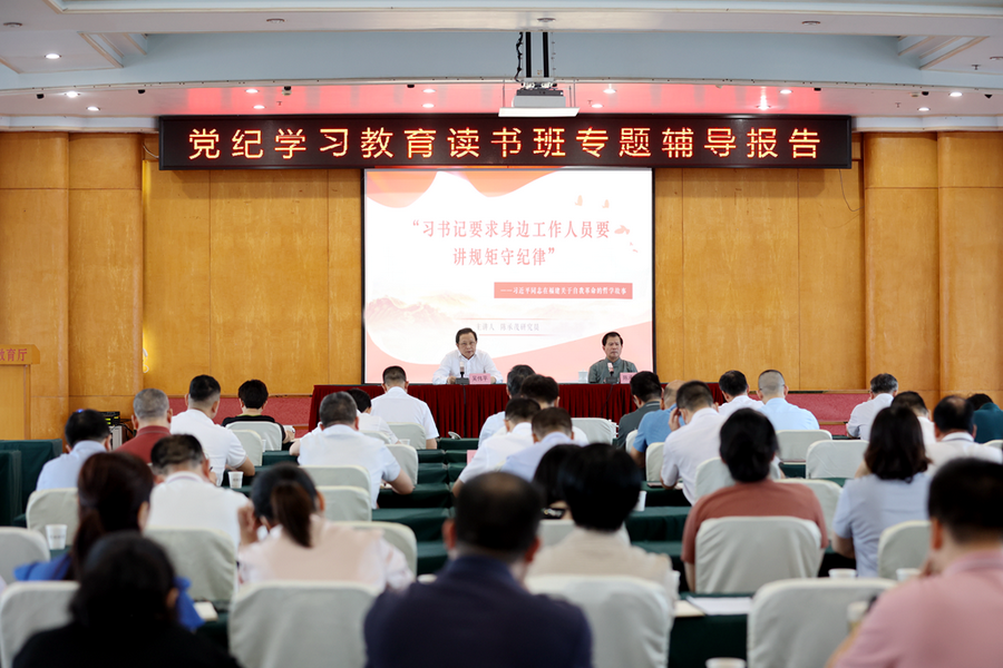 6月18日,省委教育工委、省教育厅举办党纪学习教育读书班第三场专题辅导报告。省委教育工委委员,省教育厅党组成员、副厅长吴伟平主持。福州海峡两岸和平统一促进会会长、福建红色记忆人文研究院研究员陈承茂作《“习书记要求身边工作人员要讲规矩守纪律”——习近平同志在福建关于自我革命的哲学故事》专题报告。委厅机关全体党员干部参加学习。