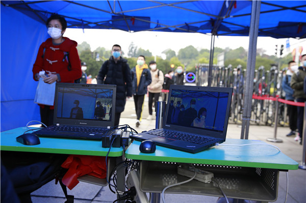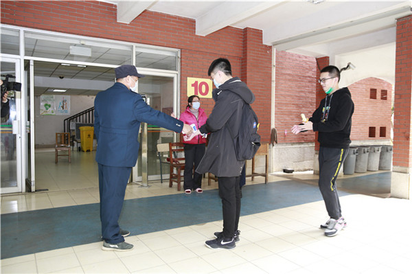 学生们戴着口罩,拉开距离排好队,有序通过体温检测点,逐一进行热成像红外测温仪检测后,方可入校。
