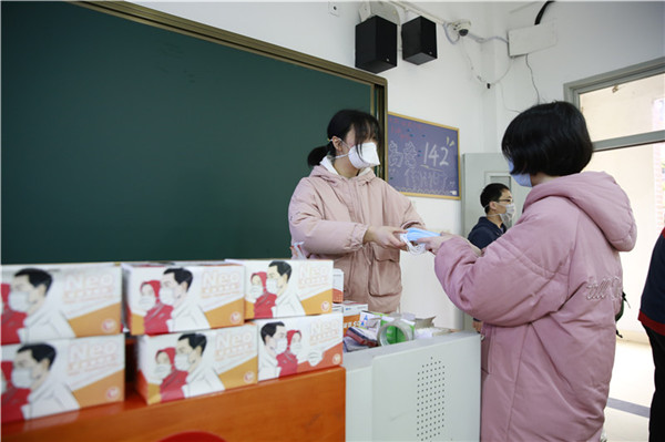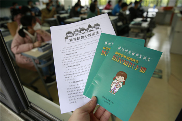 进入班级后,班主任对学生再次进行体温检测,收取学生们居家期间的体温记录表和健康信息表,并发放口罩以及由福州市教育局印发的《福州市学校师生员工新型冠状病毒肺炎防控知识手册》和学校精心编制的《复学后的心理调适》。