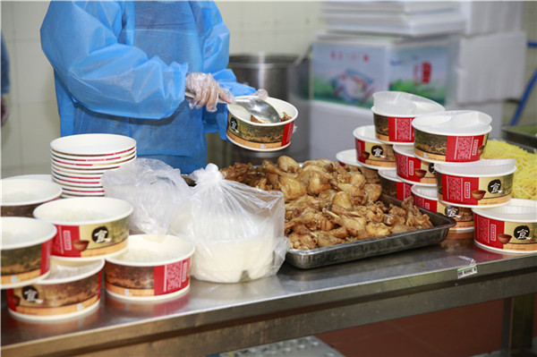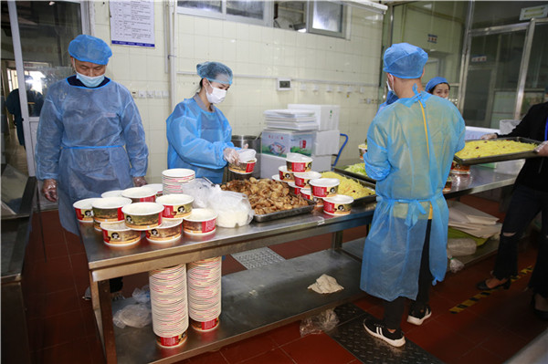 临近11点,食堂工作人员开始给高三学生们打包午餐,今天午餐有黑椒牛柳、卤鸡腿、酸辣土豆丝等。