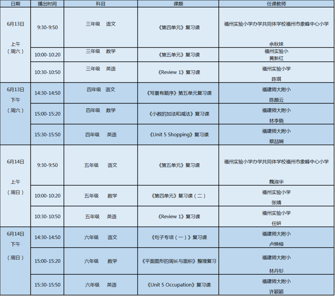 福建省小学“空中课堂”复习课课程表