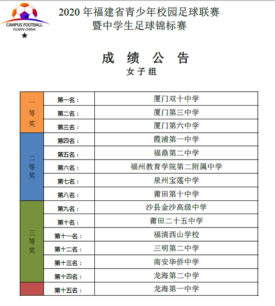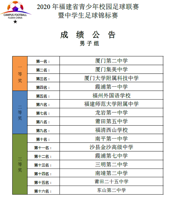 2020年福建省青少年校园足球联赛暨中学生足球锦标赛于10月15—22日在晋江成功举行。本次赛事由省教育厅、省体育局主办,晋江市教育局、晋江市体育局承办。共有来自全省各地的33支代表队、700多名运动员参赛。