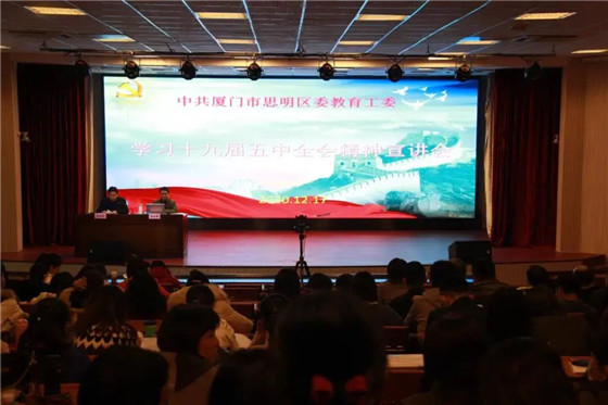 17日,宣讲团成员、厦门康桥中学公派书记李良辉为厦门思明区300余名中小学骨干教师作题为《赞赏最新最美的画卷——学习领会十九届五中全会精神》的宣讲。他建议教师们要清醒认识形势,明确职责担当,多形式引导学生学习领会党的十九届五中全会精神。