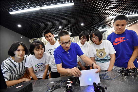 这样“标新立异”,林立灿不是第一次。2012年,他就牵头在福州一中校园里建立量子信息科学创新示范实验室。“当年省里批了180万元建设经费,因此引进的设备是很先进的,直到现在,我们的实验室在全国中学里还是独一无二。你看围绕这组部件,科研团队就能不断地出论文。”站在实验室里,林立灿非常自豪地比划着。