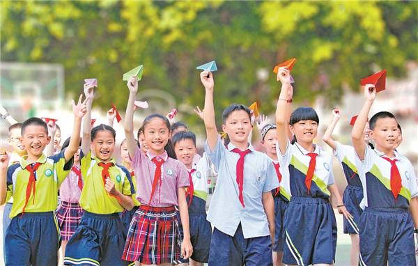 三明学院附属小学与三元区建设小学的学生代表在操场放飞希望