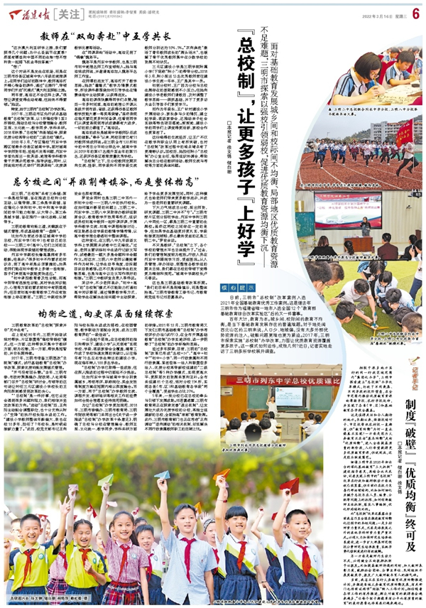 2017年,三明在市区先行试点基础教育“总校制”改革,以1所强校带1至2所弱校,推动总校与分校管理融合、教师互派、文化统一、教学同步、学科共研。2018年秋季,“总校制”向县域延伸,探索优质分校再带分校的“二级总校”模式。