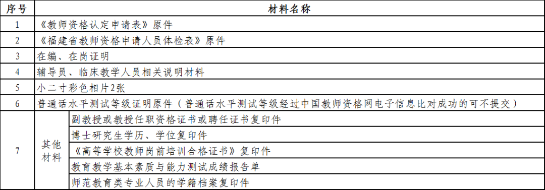 各高校要在规定的时间内将教师资格认定申报材料报送省教育厅(受理地点:福建省教育厅二楼行政服务中心),报送材料包括学校申报文件、《高校教师资格申请人员名单汇总表》以及每位申请人员的材料。申请材料不全或不符合要求的、没有网上报名的,不予受理。