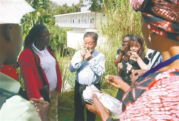 福建农林大学,林占熺教授(中)向参加培训的外国学员介绍巨菌草的生物学特性