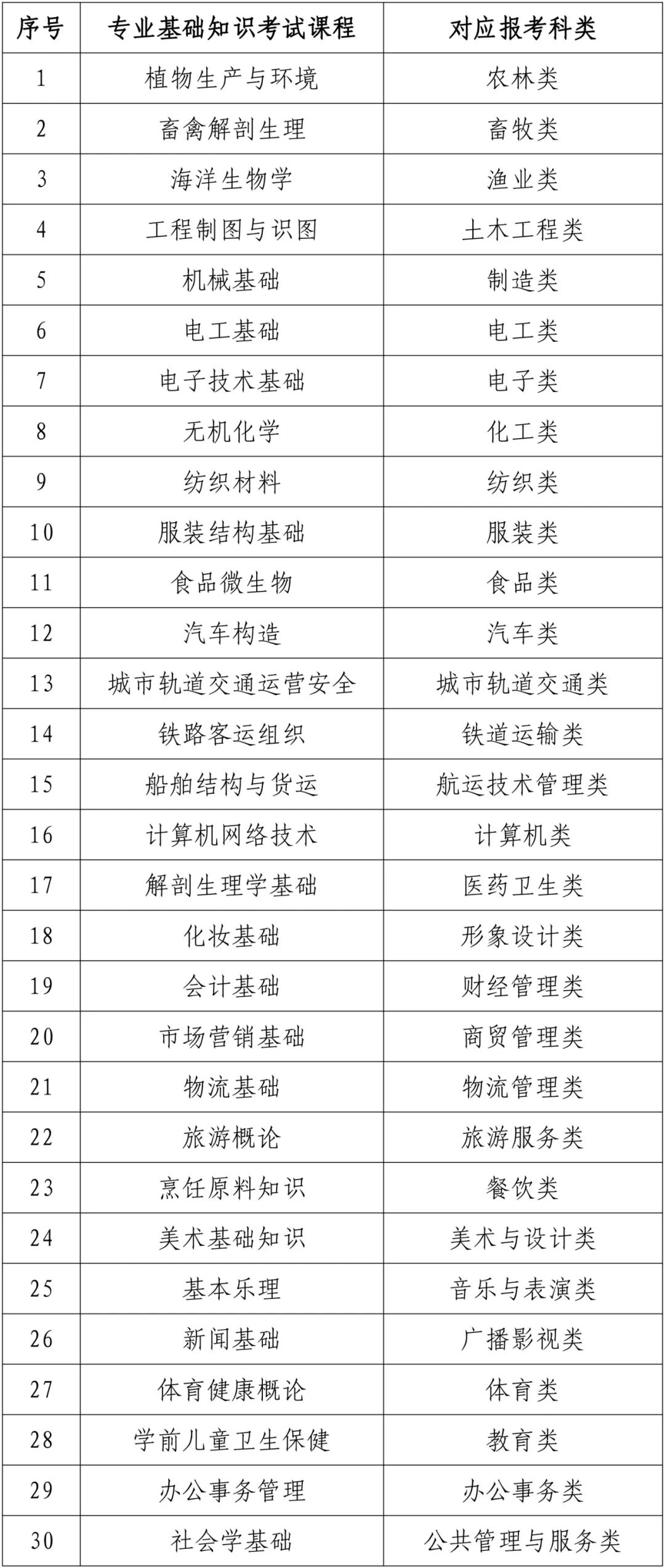 福建省中职学校学业水平专业基础知识考试课程与报考科类对应表
