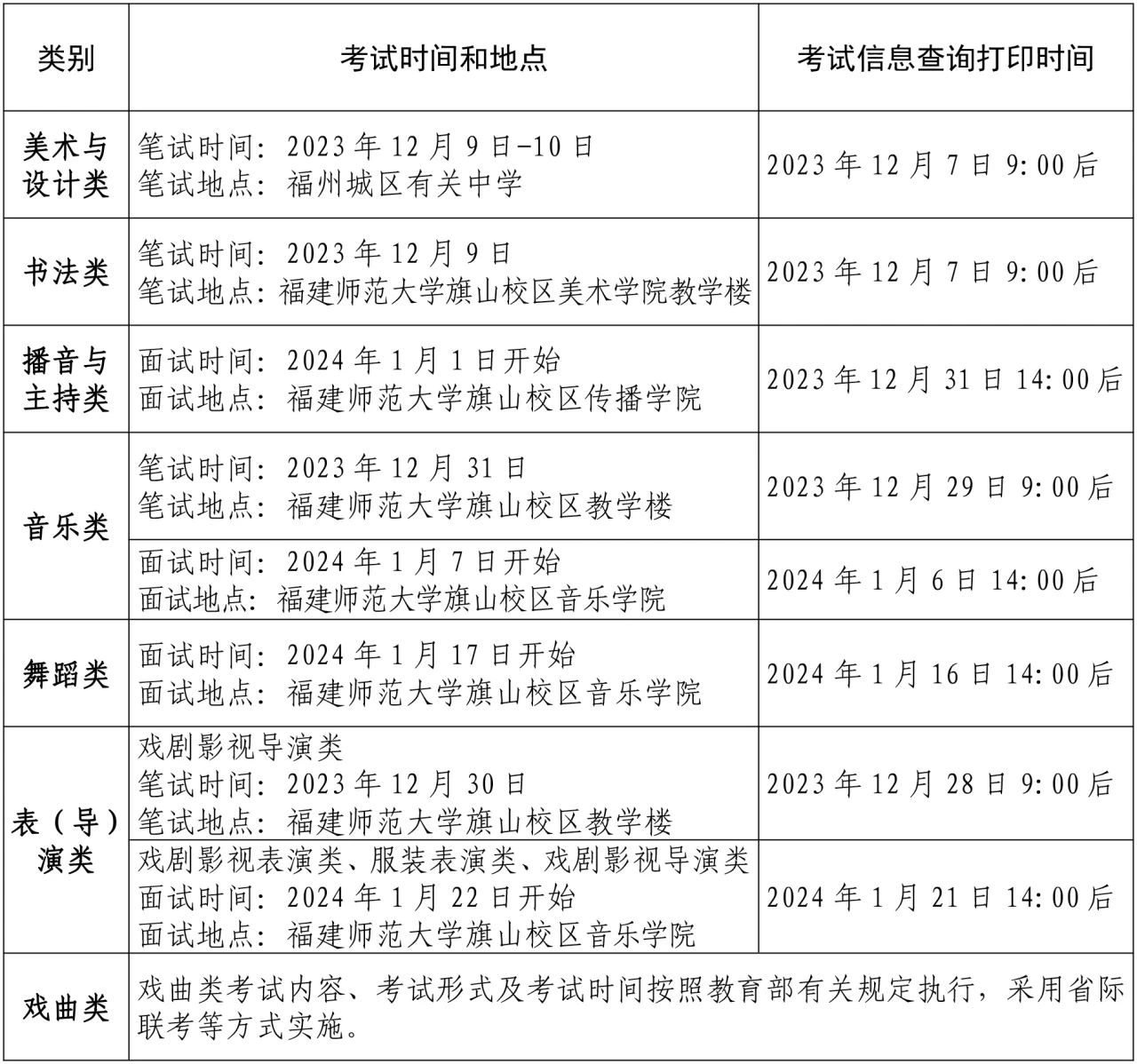 所有考生须在《2024年艺术类专业省级统考各类别考试安排表》规定的时间内登录福建省教育考试院网站(www.eeafj.cn)“数字服务大厅--高考高招--艺术类专业省级统考考试信息查询”系统,查询并打印本人笔试类科目考试证或面试类科目考试信息,其中音乐类考生还须按规定填报面试应考科目的曲目信息,并按要求参加考试。