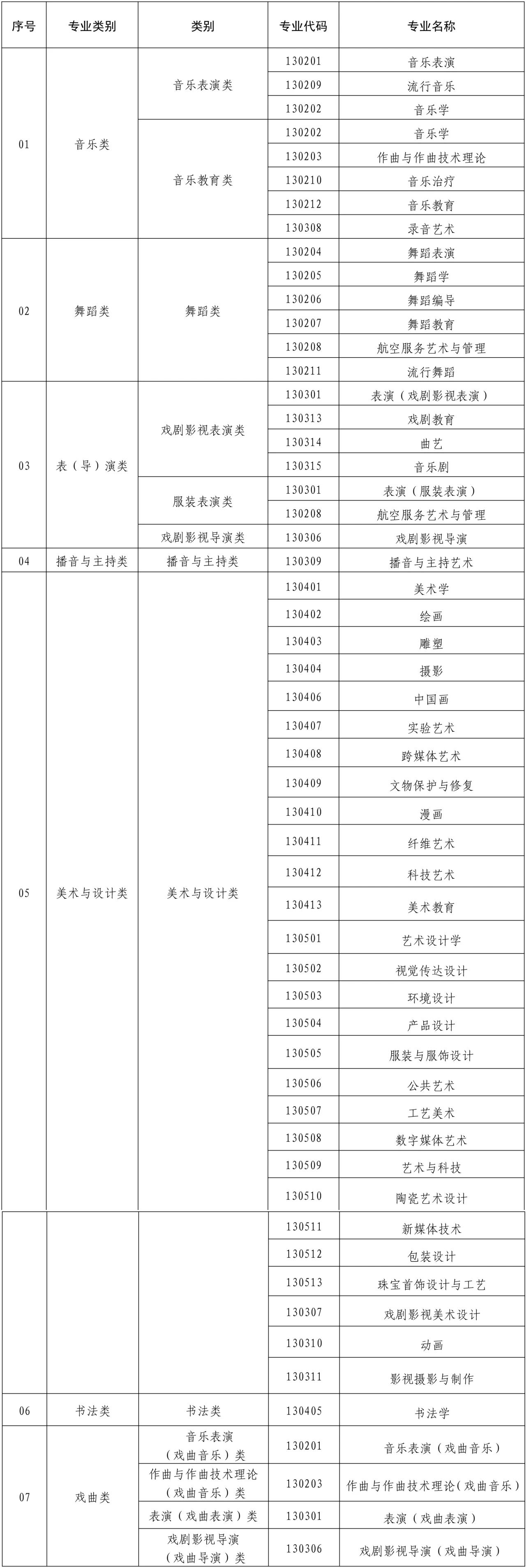 2.音乐类、舞蹈类、表(导)演类、播音与主持类、美术与设计类、书法类