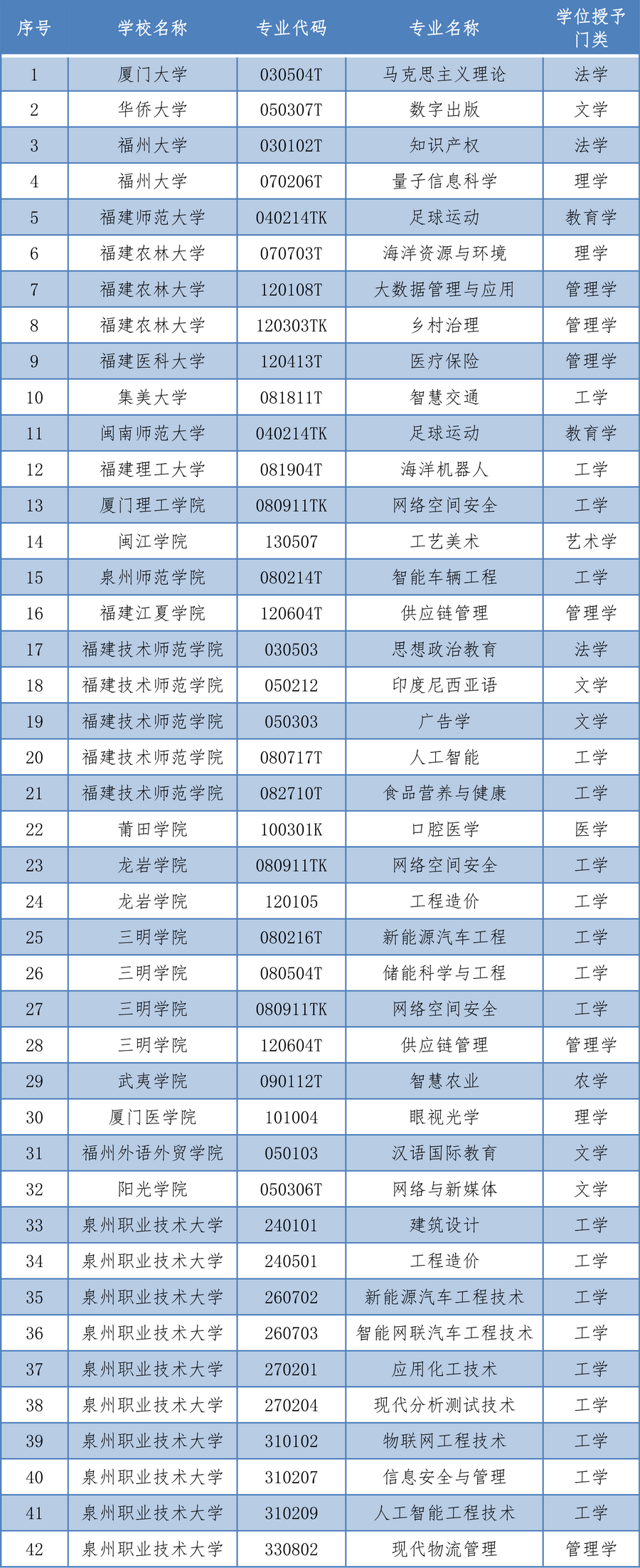 日前,福建省学位委员会印发《关于公布2025年新增学士学位授权专业名单的通知》,同意厦门大学等22所院校申请的马克思主义理论等42个本科专业增列为学士学位授权专业,并公布名单。
