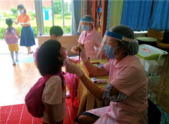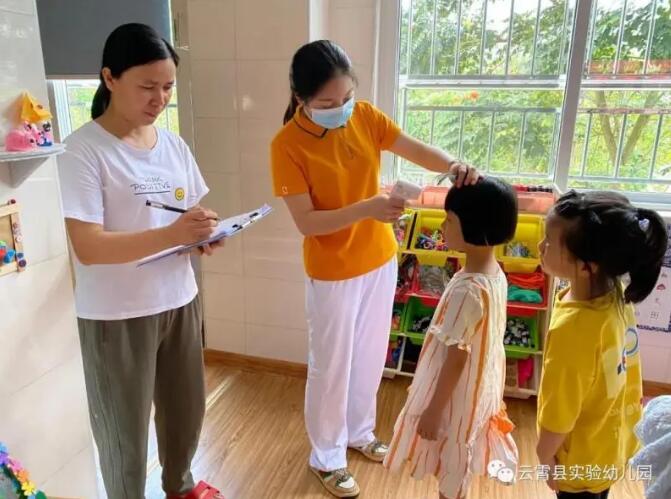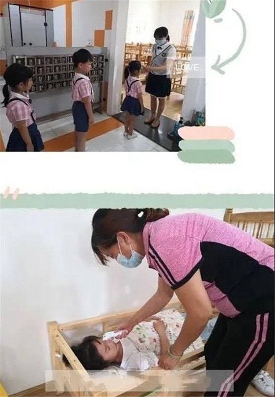 建瓯市实验幼儿园保育员为孩子们测体温、午检