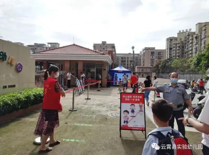 云霄县实验幼儿园的保安在幼儿园门口引导小朋友排队有序入园