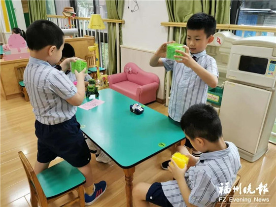 福州市蓓蕾幼儿园的小朋友在玩迷宫魔方