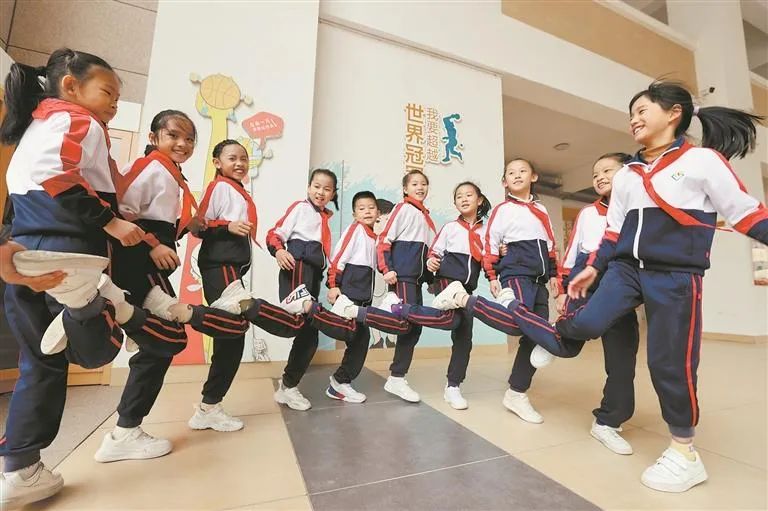 伴随着下课铃声的响起,学生们欢呼着跑出教室,尽情“撒欢儿”。他们有的在操场上跑步、踢足球、打篮球,无拘无束地享受运动的快乐;有的来到至和大厅跳房子、投沙包、玩“石头剪刀布”、拿象棋子当“冰壶”比试准度,编创属于自己的创意游戏……为了保证学生校内锻炼不少于1个小时,学校除了课间10分钟,每天还开展阳光体育大课间活动。学校会组织专门的巡查队伍,保障学生们课间活动安全。