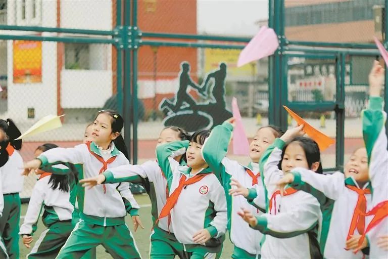 同学们跑到操场上滚铁环、跳皮筋、踢毽子、跳大绳、抽陀螺、闯关、越障碍、快乐十字跳等。学校的课间10分钟活动引入传统民间体艺项目,让学生们亲近传统文化、传承传统文化。该校还积极探索跨学科主题学习,让孩子们结合课堂项目自制纸足球、纸飞机等,进行团队合作游戏。