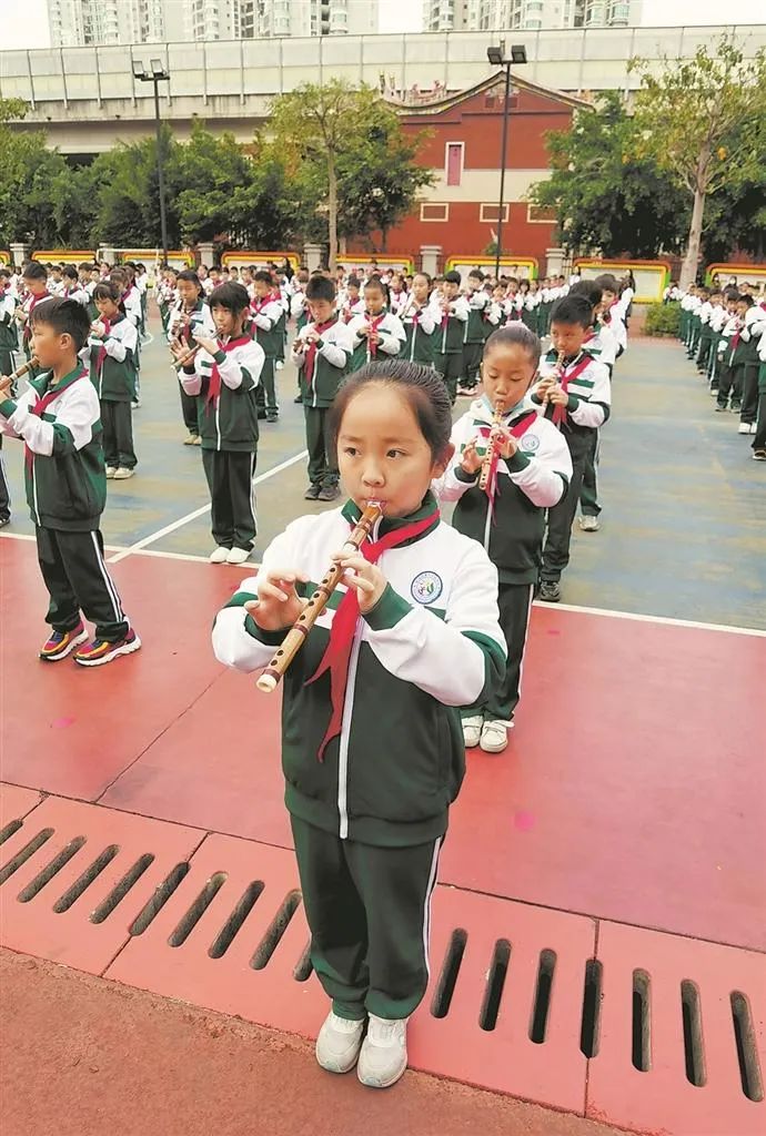 丰泽区第五实验小学的孩子们在大课间活动上吹起了顺笛(学校 供图)